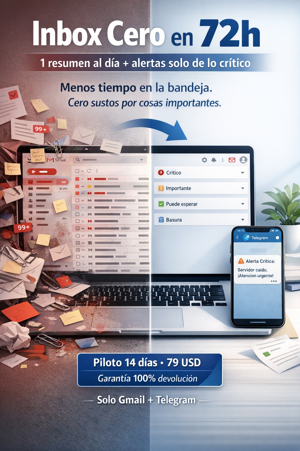 - Filtro de ruido automático: crítico / importante / puede esperar / basura